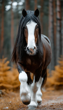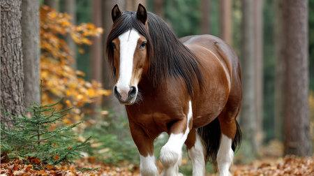 Majestic Clydesdale Horse Walking Through Vibrant Autumn Woodland, Showcasing Nature s Beauty