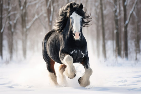 Majestic Clydesdale Horse Trotting Gracefully Through a Vibrant Autumnal Forest Landscape Scene
