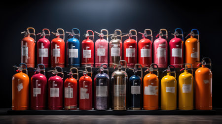 Fire extinguishers in a row on a black background. Studio shot.
