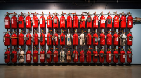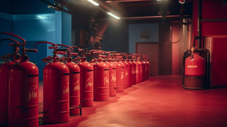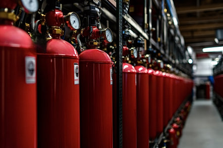 Red cylinders containing pressurized gas form an industrial fire suppression system, ensuring safety and protection against potential fire hazards within the building