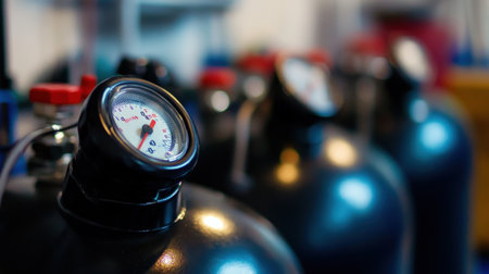 This image showcases a close-up view of a pressure gauge mounted on a black compressed gas tank, highlighting essential industrial equipment and technology.