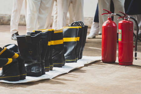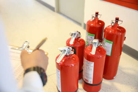 Fire fighter are checking the red fire extinguishers tank in the building concepts of fire prevention emergency and safety rescue of fire services and training.