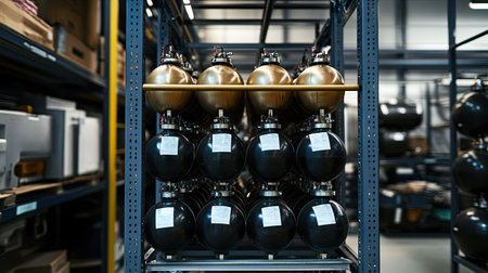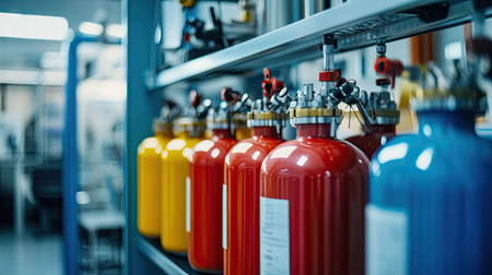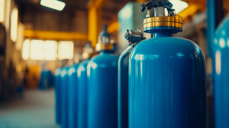 A row of industrial gas storage cylinders, showcasing modern design and functionality in a professional facility. Ideal for applications in various industries and environments.