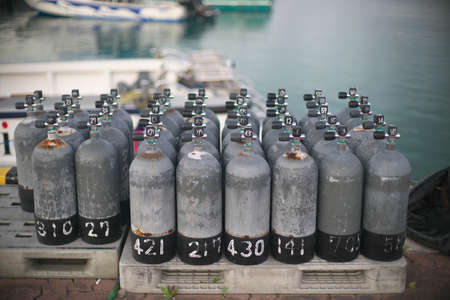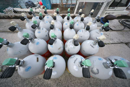 Okinawa,Japan - May 21, 2021: Scuba tanks on Ishigaki Port Pier