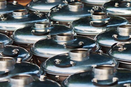 close-up of silvery gas cylinders stand on top of each other in even rows in a warehouse
