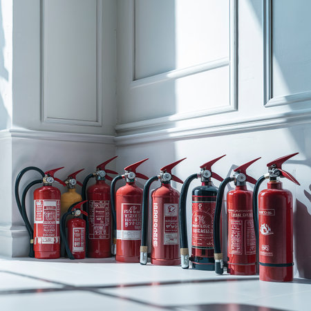 This image captures a well-organized industrial hallway featuring multiple fire extinguishers, highlighting essential safety measures and emergency preparedness.