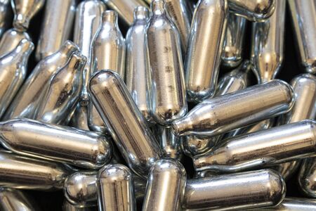 Nitrous Oxide Metal Bulb Canisters Recreational Drugs on Black Background