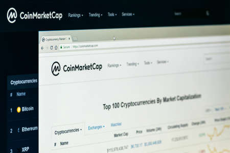 KYRENIA, CYPRUS - AUGUST 26, 2018: Home page on the screen. Coinmarketcap is a website for tracking capitalization of various cryptocurrencies