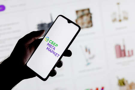 Kazan, Russia - Oct 18, 2021: SberMegaMarket is a Russian marketplace owned by Sberbank. A smartphone with the SberMegaMarket in a hand.