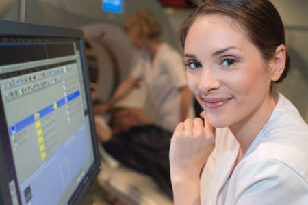 Young confident radiologist in gloves and uniform standing against medical equipment in clinics