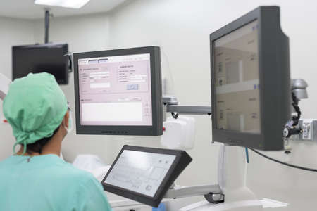 Modern Cath Lab showing LCD monitor with the doctor, nurse, and patient in the hospital, patient during treatment in Cath Lab Blurred of background.