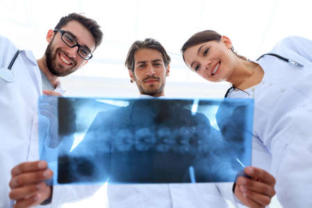 Doctor demonstrates an X-ray of the male prostate gland, to diagnose the X-ray picture of the prostate, on a white background.