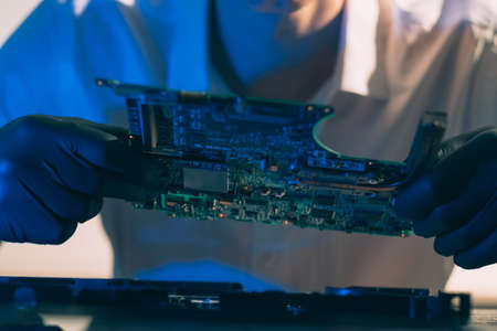 engineering laboratory. technology innovation design and hardware development. technician holding motherboard.