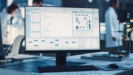 Over the Shoulder Shot: Female IT Scientist Uses Computer Showing System Monitoring and Controlling Program. In the Background Technology Development Laboratory with Scientists, Engineers Working