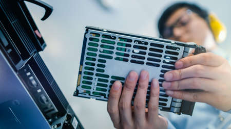 In the Data Center: IT Engineer Installs New HDD Hard Drive and Other Hardware into Server Rack Equipment. IT Specialist Doing Maintenance, Running Diagnostics and Updating Hardware. Low Angle.