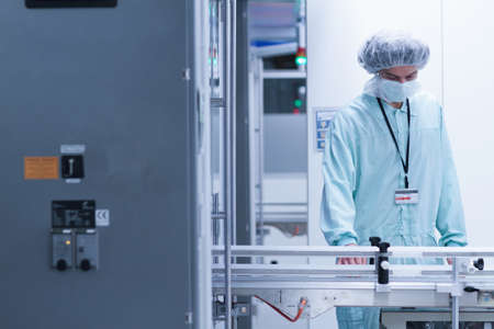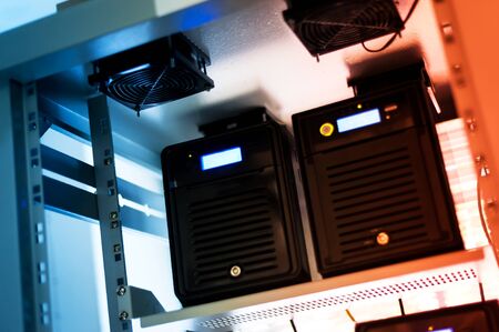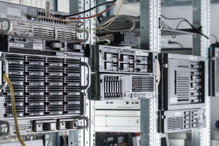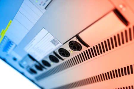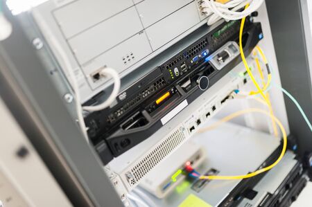 Engineer controls industrial digital equipment mounted in a rack. Selective focus.