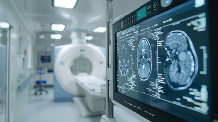 A modern radiology lab showcasing advanced medical imaging technology with high-resolution monitors displaying detailed brain scans and data.