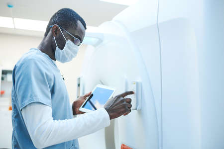African-American MRI technologist in mask and glasses holding tablet while turning on equipment