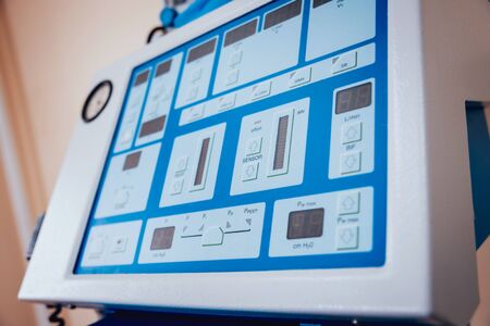 Bucharest, Romania - November 22, 2020: Shallow depth of field (selective focus) image with details of the control panel of an ultrasound machine.