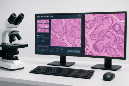 Modern pathology workspace featuring microscopic tissue samples on dual monitors, a traditional microscope, keyboard, and mouse, highlighting advancements in digital pathology