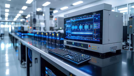 An electronic device, such as a computer monitor and keyboard, is placed on a table in an engineering laboratory. The monitor is displaying an electric blue screen