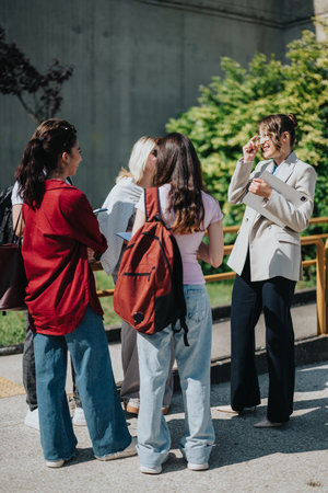 Group of students and professor having a discussion outdoors on a sunny day