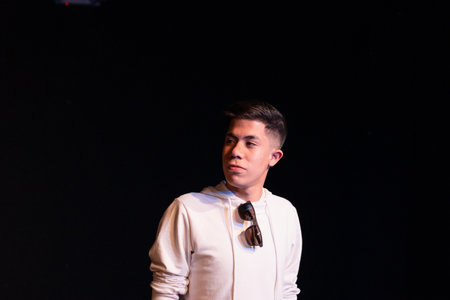 A man wearing a cap stands on a dark stage, holding a microphone and gesturing with his hands while speaking. A bright spotlight illuminates him. In the background, a projection screen the text You said:. The scene suggests a presentation, a talk, or a performance in a modern setting, focusing on the act of communication and conveying a message.