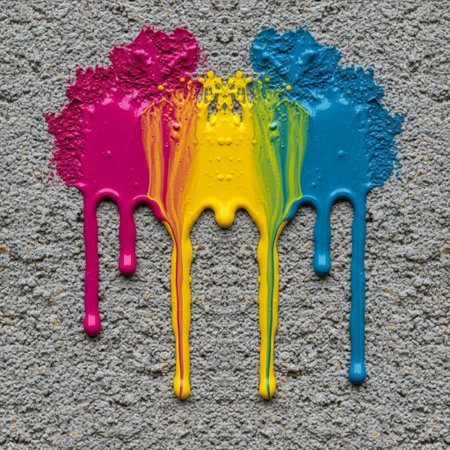 Vibrant wet ink splashes creating glossy textures in an artistic setting