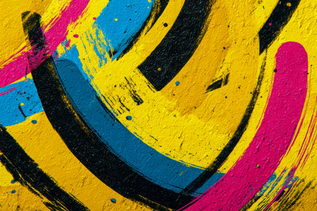A lively wall masterpiece with bold, sweeping strokes in vivid yellow, deep blue, soft pink, and striking black, conveying a sense of movement and energetic artistry