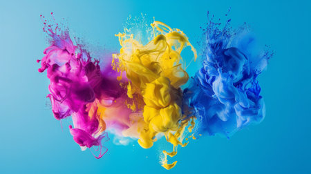 Colorful abstract background showcasing vibrant splashes of pink, yellow, and blue paint, creating a dynamic and expressive modern art scene