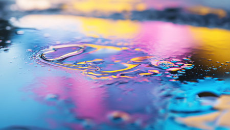A close-up of an oil slick on water, with vibrant colors and intricate patterns created by the flowing liquid. The background is blurred to emphasize the vivid hues of blue, purple, pink, yellow, and orange in various parts of the puddle. --ar 53:30 --v 6.1 Job ID: f2021ed5-6ba2-4470-9cf8-91cf18d007b0
