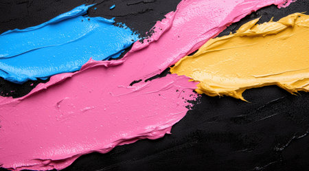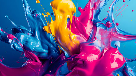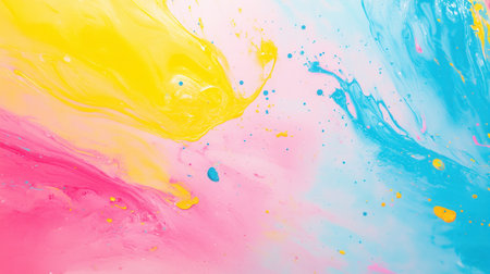 Colorful abstract background showcasing vibrant splashes of pink, yellow, and blue paint, creating a dynamic and expressive modern art scene