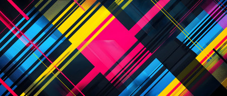 Dazzling abstract geometric plaid pattern with vivid neon pink blue and yellow shapes and hues against a deep inky black background creating an energetic and lively visual composition