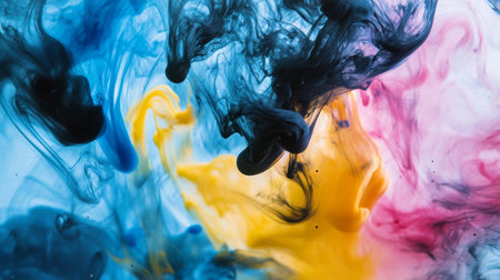 Abstract ink in water with vibrant blue, yellow, and pink colors