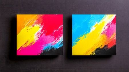 Two squares showing cmyk color model mixing, creating colorful brush strokes