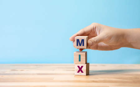 Marketing mix with text on wood blog.business strategy or creativity concepts.copy space