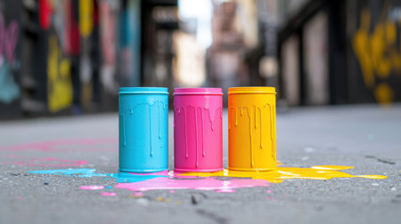 Three vibrant paint cans in blue, pink, and yellow are placed on the street, creating a colorful scene as paint drips and spills onto the concrete surface.