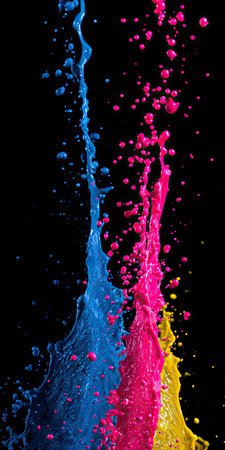 This dynamic image captures vibrant splashes of paint in a mesmerizing display of color and motion, set against a dark backdrop creating an artistic and energetic visual experience.