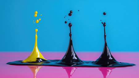 Abstract composition features three streams of vibrant water in blue, magenta, and yellow. The droplets and lines of color appear against a stark black background. The image has high visual impact. Suitable for creative projects, design, or commercial applications.