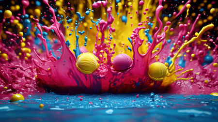A stunning display of colorful paint splashing into water with balls creating vibrant waves. Perfect for creative projects and artistic backgrounds.