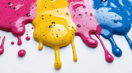 Bright pink, yellow, and blue paint drips blend on a clean white surface, showing an artistic moment captured during a creative activity.