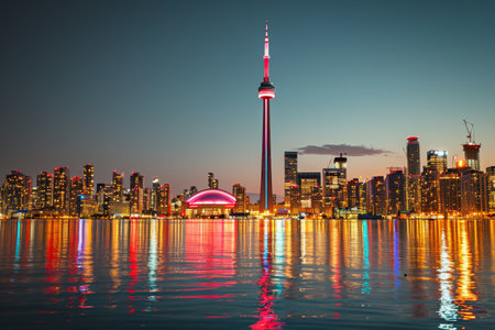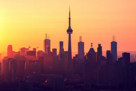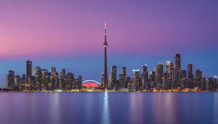 Panoramic view of the beautiful Toronto skyline at sunset, featuring the city's iconic buildings and landmarks. The CN Tower stands tall amidst the colorful sky and reflects on the calm waters of Lake Ontario. This stunning image captures the vibrant energy of Toronto, a modern and diverse metropolis in Canada.