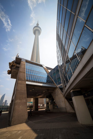 TORONTO-CANADA, 10 APRIL 2017: CN tower, third tallest tower in the world and the tallest free-standing structure in the Western Hemisphere, a signature icon of Toronto's skyline, and a symbol of Canada