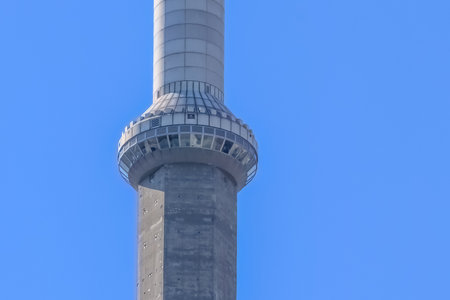 TV Tower in Toronto, Canada. Black and white. Vertical. Modern architectural building detail - a tower on a clear blue sky background. general panoramic view with copy space