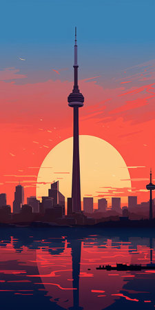 the cn tower stands majestically at sunset, its bold clean lines and minimalistic illustration style reminiscent of olly moss and firewatch, set against a serene backdrop of the blue ocean spanning the bay, making for a stunning desktop wallpaper in 2d vector design. ai generated