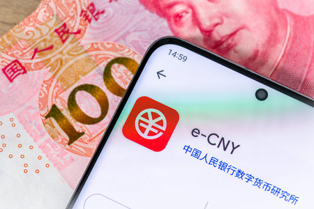 London. UK- February 04. 2026. A macro closeup of the Chinese Digital Yuan or e-CNY application on a mobile phone with a 100 Yuan bank note in the background.