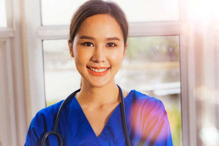Profile portrait professional Asian female surgeon wearing blue uniform with gentle stethoscope positive attitude professional female doctor therapist.