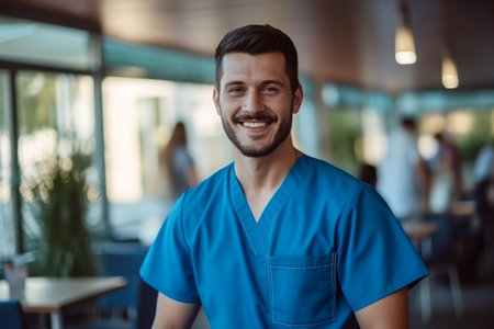 Smiling young healthcare worker in blue scrubs at the hospital