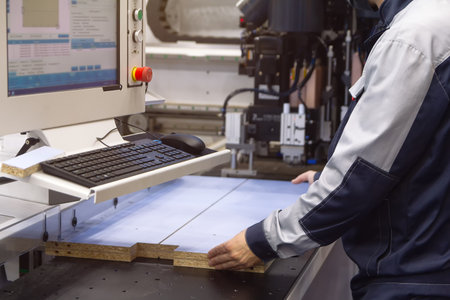 Carpenter operating a cnc machine, crafting furniture components with precision and expertise in a bustling factory environment