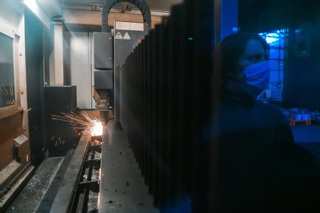 Automatic cnc laser cutting machine working with sheet metal with sparks at factory, plant. Metalworking, industrial, machining, technology, manufacturing, equipment concept